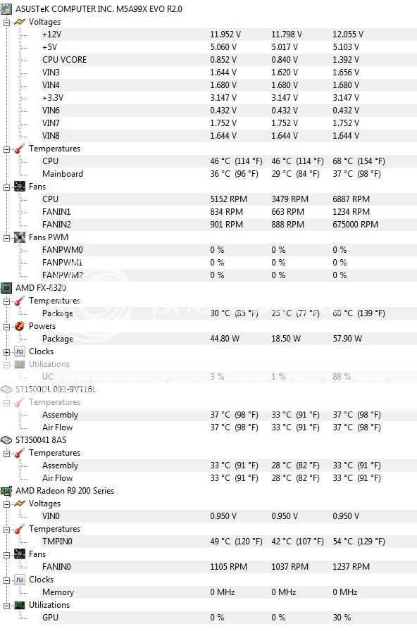 Have an fx8320, asus M5199X mobo. The CPU idles at 40, runs at 50 for videos and goes to 60+ for light performance games (like card games). Have cleaned it out of dust, replaced the thermal paste (while checking the heatsink/fan were all inplace correctly)... the fans all seem to be functioning..